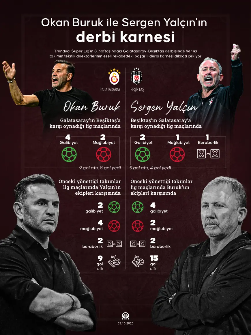 Trendyol Süper Lig’in 8. haftasında oynanacak Galatasaray-Beşiktaş derbisi, sadece oyuncuların değil, teknik direktörlerin de rekabetini sahaya taşıyor. Okan Buruk ve Sergen Yalçın’ın ligdeki derbi karnesi, karşılaşmanın sonucunu merak eden futbolseverler için önemli ipuçları sunuyor.